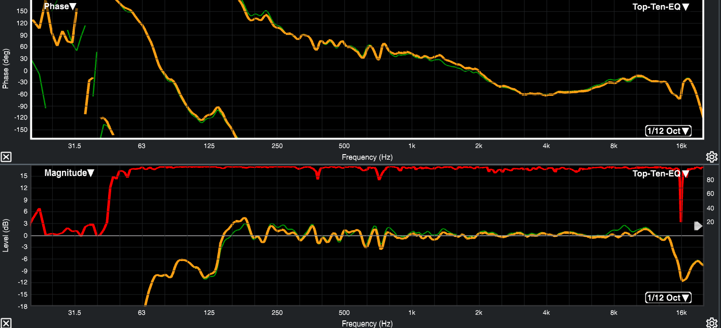 Frequenzgang&Phase Roh+DSP![]() (Roh = grün, DSP EQ = orange - ab 500Hz aussagekräftig) |