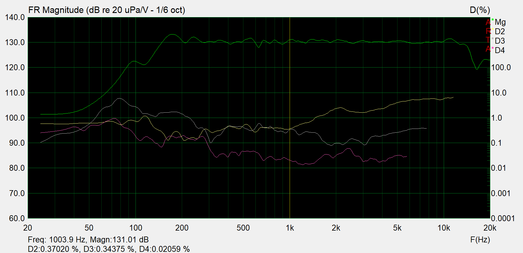 Durch den hohen Headroom des 1,4" Treibers bleiben die Verzerrungen auch bei 35V rms noch gering (1kHz 0,38% K2 / 0,30% K3, 7kHz 5,41% K2 / 0,36% K3).